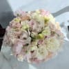 This floral arrangement is soft, romantic, and garden-inspired, featuring a lush blend of blush pinks, creamy ivories, and gentle hints of pale green. Delicate roses, ruffled blooms, and airy sweet pea-like petals create a cloud-like texture, giving the design an effortless, organic feel. The palette is light and soothing, with subtle variations in tone that add depth without overpowering the senses.
