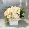 This arrangement has a very refined, elegant, bridal feel-soft ivory and cream garden roses, delicate white blooms, and lush greenery cascading slightly from a modern white container. Names that reflect purity, elegance, and softness would suit it well.
