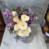 This arrangement has a very romantic garden feel-soft cream garden roses, airy lavender lilac, and delicate trailing jasmine in a classic blue-and-white vase. The palette feels elegant, fragrant, and slightly nostalgic, almost like something gathered from an early spring garden.