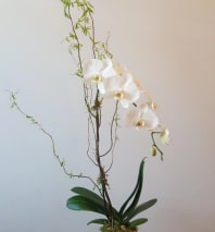 An attractive porcelain pot houses this live mini phalaenopsis orchid, which has been accented with branching, fresh moss, and river rocks to create a truly serene touch to any home or office. Let us know if you prefer a white or colorful flower and we will do our best to accommodate (depending upon availability).