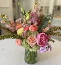 Coral garden roses, green hydrangea, moody stock and tulips, hanging amaranth and peach ranunculus make up this garden inspired beauty!