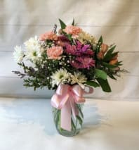 This bright, cheerful, mix of purples, yellows and lavenders will bring a happy smile to someone special in your life. Perfect for birthdays, just because, get well soon or any special occasion. It will be delivered in a clear, glass, vase complete with our custom, hand made, bow. Send some happiness to some special today.