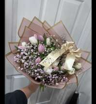 A bouquet of soft colors with a fresh design, wrapped in paper that complements the colors, creating a lovely feeling for the person who receives it. The bouquet includes a tiara, making it even more special and elegant. (Standard 15stems of roses , carnations ,stock,Deluxe 25 stems of roses ,carnations,stock,Premium 30 stems of roses ,carnations,stock)