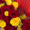 Red and yellow flowers arranged inside a red flower box with a tough of sparkle.