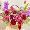 Featured Blooms: Roses, spay roses, stock, tulips, snapdragons, Alstroemeria, and greeneries