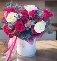 The “Pure Grace” is an elegant arrangement featuring pristine white chrysanthemums and classic roses. Presented in a chic hatbox, this bouquet combines the lush fullness of chrysanthemums with the timeless beauty of roses, creating a sophisticated and serene display. Perfect for any special occasion or as a thoughtful gift, this arrangement brings a touch of grace and purity to any setting.