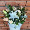 • Premium: 7 Peach Roses, 6 Peach Carnations, 3 Crystal Blanca Lilies, 5 White Lisianthus, Chamomile, Eucalyptus, Garden Greens