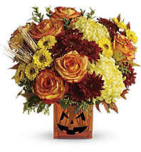 With its sunburst colors, the perfect choice for Fall is The Harvest Heartstrings Bouquet! This festive arrangement consists of orange spray roses, yellow lilies, red miniature carnations and delightful miniature sunflowers. Send your warmest seasons greetings for a birthday, get well, thank you or Thanksgiving gift with this eye-popping display!