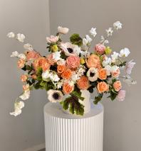 Blushing Orchid Garden - Blushing Orchid Garden, a captivating blend of luxurious orchids and timeless garden roses. Soft blush orchids, with their delicate, exotic petals, take center stage, exuding a sense of refined beauty and grace. Surrounding them, full-bloomed garden roses in gentle shades of blush and ivory add a romantic, classic charm, creating a soft, sophisticated contrast.