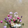 Dainty arrangement comprised of the most majestic blooms, emphasizing tuips and sweet peas for an airy delicate gesture. Blooms are gathered in a small ceramic bowl which serves as a beautiful keepsake. Blossoms are soft hued evoking precious yet refined pallet.