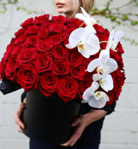 Feeling and sending love with the perfect vintage hat box styled arrangement. Boasting over a dozen premium red roses bursting with loving wishes for any special occasion. All wrapped up with a beatiful double faced red satin bow.