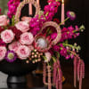 A collection of premiums flowers in different shades of Pink; stylized in a black bowl. Candlesticks not included.