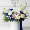 Modern clean design of crisp white premium floral, blue and silver accents in a white vessel with wintergreens