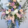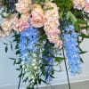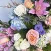 Beneath the willow circle, the arrangement blooms with a colorful blend of fresh flowers including pink lilies, white and peach roses, blue hydrangea, pink snapdragons, carnations, button mums, peach stock, wax flowers, blue delphinium, and thistle. The combination of soft pastels and vibrant blue tones creates a joyful and uplifting display that beautifully reflects a life well lived. Each bloom adds texture, color, and depth, resulting in a full, elegant spray that stands out during memorial services or celebrations of life.