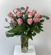 Each velvety red rose blooms like a love letter, symbolizing adoration, courage, and heartfelt promises, their towering stems a testament to grand romance. Paired with the silvery softness of eucalyptus, they bring a breath of serenity, renewal, and earthy charm, enhancing the bouquet’s ethereal allure. Together, they craft a vision so luxurious and meaningful, it’s the perfect way to shower your soulmate with pink-kissed devotion.