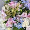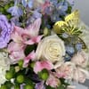 Order the Make Me Flutter Bouquet today for same-day flower delivery in Irvine, butterfly-themed floral gifts, or white rose alstroemeria arrangements. Keywords: make me flutter bouquet, white hydrangea pink alstroemeria, purple lisianthus blue delphinium, gold butterfly flower arrangement, romantic pastel bouquet.