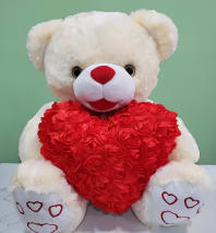 This cute wrap bouquet is made up of blue roses surrounding a sweet white bear. All wrapped in blue and white paper and tied with blue and white bow.