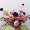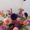 Inspired by a beautiful lavender rose variety, moody blues. Perfect for autumn! Designed in a white ceramic vase with a variety of flowers including; Dahlias, garden spray roses, French marigolds, lisianthus, snapdragons and more.