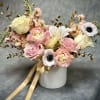 Soft blush, ivory, and peach blooms paired with golden accents create a look of timeless elegance. Arranged in a sleek ceramic vase, this design adds warmth and sophistication to any occasion.