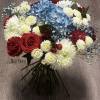 Introducing our design Freedom Flowers! Beautifully arranged with roses, carnation, mums, Alstro, hydrangeas, buttons fillers and greenery wrapped with red blue ribbons and comes with the flag.