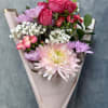 Our petite Pink Breeze hand-tied bouquet features cheerful mums, spray roses, daisies, and mini carnations, all wrapped in soft pink paper for a sweet, charming touch — perfect for brightening someone’s day.