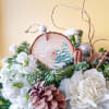 Collect Evy' hand-painted Wooden Christmas tree ornament. Each ornament is hand painted so slight variations may be present. The ornament is placed in a gorgeous winter looking arrangement of white flowers and winter greens as if sitting on a fresh snowfall.
