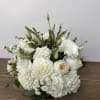 glass vase with a white hydrangea, white dahlia, garden roses and white tulips