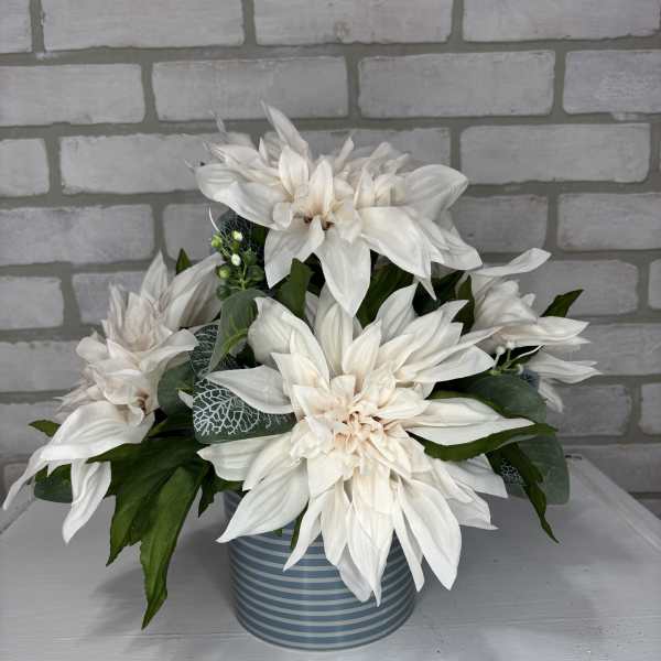 I had to order flowers for a funeral on short notice. I always am worried when I use an out of town florist because of bad experiences - dead flowers, wilting plants, much smaller arrangements than bought. HOWEVER - this arrangement was lovely! Bigger than I thought, healthly plants, set nicely in the low planter! I was so pleased! Janine's Flowers helped a lot on a sad day.