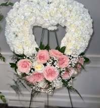 This is a very unique package. A classy and clean floral decor for your loved ones service. Arch is made of lush greens, roses and stock. This package will include the two arches and the Jose Miguel full casket cover. Contact us if you wish to just order the arches.