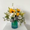 This white and yellow arrangement of daisies, roses and sunflowers in the blue ombre vase is sure to brighten a dark day!