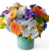 Lovely roses orchids and so much more arranged in a modern glass cylinder vase. Perfect for every occasion to show them how much you care. All fresh flower bouquets that leave my flower shop studio are beautiful works of art made special each time. Please visit my beautiful gallery to see my latest designs that I have created for my online customers. Send them happiness today.