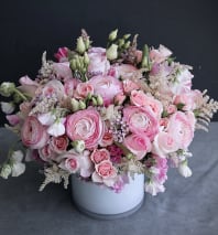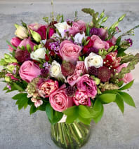 This bouquet contains seasonal mixed florals such as green hydrangeas, coral peonies, pink or peach roses and others beautifully arranged in a glass vase. Handwritten card is included. Send the most beautiful flowers for that special someone. Next day delivery available to Tequesta, Jupiter, Palm Beach Gardens and Palm Beach.