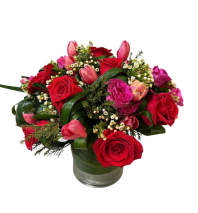 Lilies, Roses, Tulips with greenery in a wooden vase