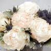 Vibrant, uniquely textured blue thistle draws a stark contrast against perfectly ruffled winter white peonies in full bloom. Silvery grey dusty miller leaves perfectly compliment this cool toned design, with the stems exposed from within the 6" by 6" glass vase on a bed of SILVER gravel. The Winter Thistle stands at approximately 12" tall overall.