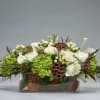This arrangement exudes natural elegance with its harmonious blend of soft white and green hues. At its heart are delicate white ranunculus and hydrangeas, symbolizing purity and grace. Vibrant green hydrangeas add a refreshing touch, while textured lotus pods lend an earthy, rustic charm. White hypericum berries provide a festive accent, complementing the soft greenery and fine dark foliage. Arranged in a clear vase lined with magnolia leaves, this design brings a natural yet sophisticated aesthetic. Perfect for a winter celebration, an elegant gift, or to brighten any room with a serene and organic vibe.