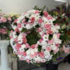Funeral wreath in white and pink.