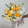Elegant bouquet featuring garden roses, hydrangea, stock, and tulips, beautifully wrapped in decorative paper for a fresh, modern look. All bouquets come without a vase; you can add one in the add-on section.