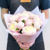 Pink peonies with greenery and decorative wrapping paper. All bouquets come without a vase. You can choose a vase in the add-on section.