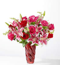 Celebrate love's radiant hues with a stunning Valentine's Day mix of red and pink blooms in a shimmering faceted pink glass vase that sparkles with modern romance.