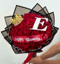 A delightful arrangement of 12 red roses, babybreath and a festive ballon with a celebratory message.