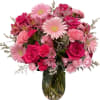 Our Pink Blooms Vase bursts with personality, celebration, and of course- pinks! This custom exclusive is sure to make a long lasting impression with its vibrancy and all-pink beauty. From hot pinks to light pinks, this monochromatic style holds a beautiful blend of tones and textures. Our top designers hand select the most lush assortment of pinks to create a beautiful display that bursts with originality like your favorite bubble gum! With a unique variety of blooms included like, roses, gerbera daisies, carnations, miniature carnations, alstroemeria and more, your recipient will get to admire the beautiful pigment of each individual bloom as well as the masterpiece created when all articulately placed together. This bright and bold display is arranged within a clear glass and accented with delicate greenery for the ultimate style! Whether you are looking for the perfect selection for a special celebration or just looking to brighten someone's day, it's always best to think pink!