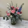 Mix shade of pink roses with blue delphinium , hydrangeas with mixed greenery in vase