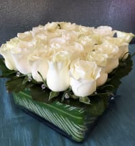 A glass cube lined with leaves and filled with roses and orchids in shades of red and bright green. Muy caliente! Approx. 10" wide x 10" tall.