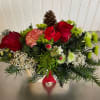 Christmas greens, reds and whites and more green to create a fun, festive arrangement in a cute gnome container. Spread the Christmas cheer with this adorable little gnome.