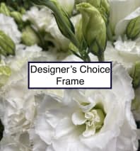 This white sympathy frame is made with all white roses and a lily and greenery corner accent. This frame is a lovely choice to honor your loved one.