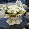 This elegant, luxurious floral arrangement features white and blush Roses with antique Hydrangea, in a stylishly wrapped glass vase, and embellished with strings of pearls for a timeless touch