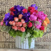 This bold floral arrangement features a vibrant mix of hot pink Peonies, Tulips, and Roses, with peach Roses, purple Vanda Orchids, and assorted greenery in a ceramic vase