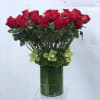 Make a statement of love with this beautiful arrangement of 50 red Roses and green Cymbidium Orchids surrounded by Dianthus