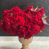 A lush , statement arrangement overflowing with velvety red roses accented with glossy anthuriums for modern , sculptural touch . Designed in a warm textured pedestal vase, this piece blends classic romance with contemporary elegance- perfect for luxury gifting , anniversaries, proposal and Valentine's Day .