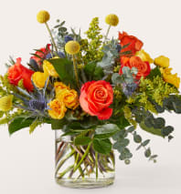 Disco Bouquet dazzles with vibrant Orange Roses, Yellow Spray Roses, and wild Thistle Eryngium, accented by playful Solidago and rustic Eucalyptus.